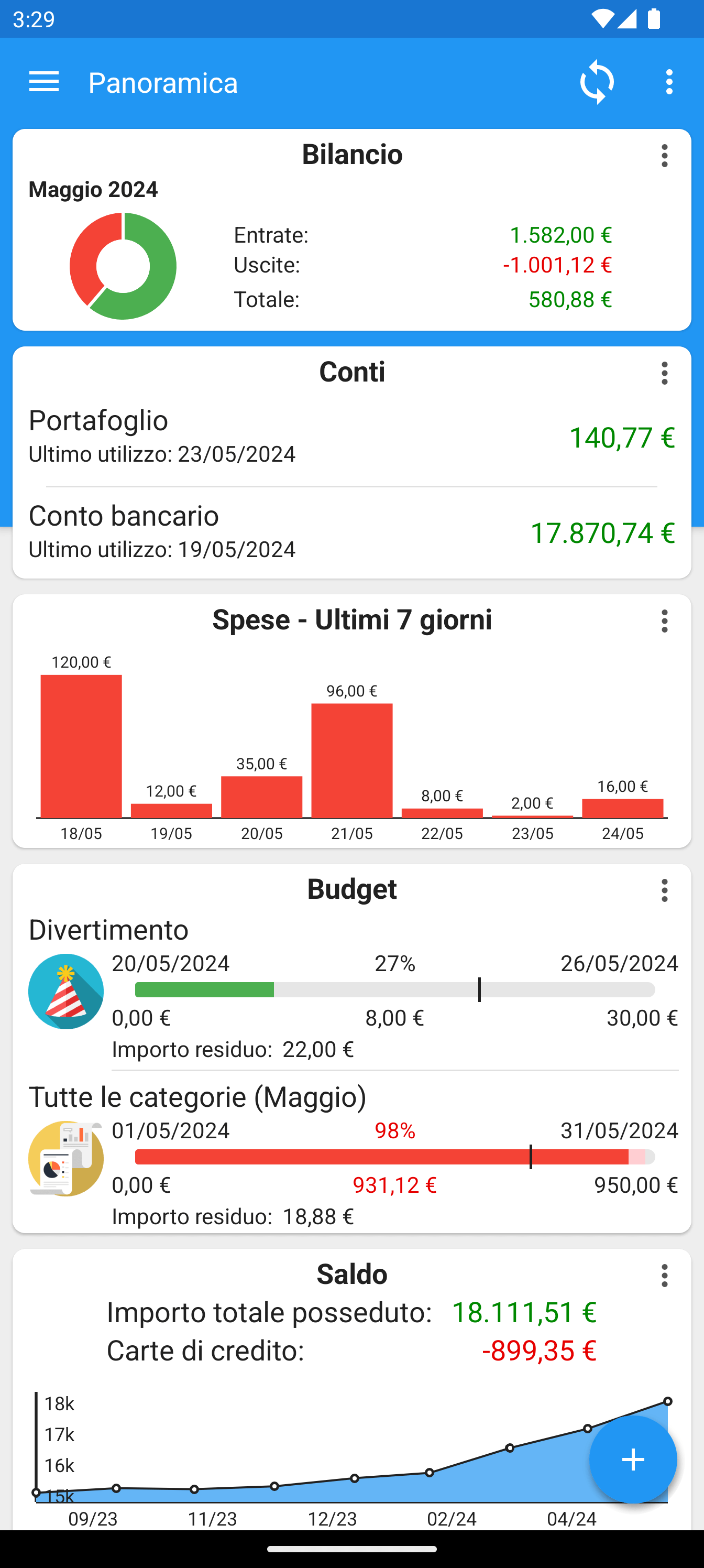 Sono presenti diversi grafici e report per vedere l'andamento del capitale nel conto. Una intera sezione è dedicata alle carte di credito.
